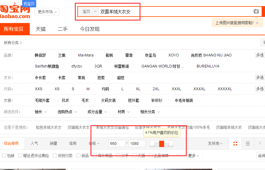 产品的定价。定价建议搜索最大的关键 例如我现在卖双面羊绒大衣女,我定多少钱合适呢 ?看下面的图很明显双面羊绒大衣女41%的客户喜欢是在660-1080 那么我们定价大概就是799元,为什么要799元,而不是800 元。这个大家第一感觉是告诉我一个要800多一个只要700呢?虽然只差一元。现在是刚立秋,冬天还是比较远。这个时候很多人只是看看,并不是会去买,而这个时候我们是要去引导这些人去买,现在大家都是去满减,这个时候你就要去变通,现在基本都是满减200满减300这样子 。这个大家可以去看市场。一定要学会去分析,不能守着店铺一天还不晓得做的啥啥啥呢?