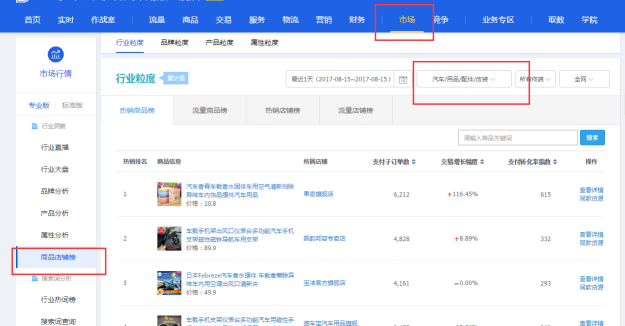 我们首先要用市场行情里面-商品店铺榜-选好自己的要看的产品的类目-找到和我们宝贝价格差不多的产品, 找到那种最近做起来款的宝贝,看他们最近是怎么做起来的,找到这种产品我们要盯住看(在你做的时候没事去看看人家现在在做什么), 看最近他是怎么操作, 对于那种微淘来的个几千几千的的店铺大家不要去看,一般这种店铺已经积累了几十万上百万的粉丝,对于我们来说 还是有点差距的。多找几个那种不是靠粉丝起来的宝贝,看他们怎么做起来的。注意观察他们前期的转化率,以及快速用直通车去拉 手淘搜索去拉的节点。注意去关注这些。像现在毛衣和呢子大衣,大家都是爆的手淘首页的流量,直通车随便拉拉就容易暴起,这种说明我们去做也能很容易拉起来手淘首页的流量 ,按照他们的做法我们至少有个参考,拉流量的时候不会那么麻木,当然不同的店铺,权重不一样拉起来的程度可能是不一样的。