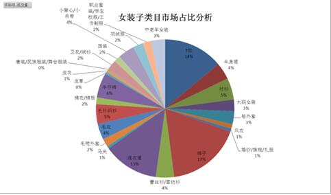 一个行业都有其数据化体现,我们可以先从行业大盘数据开始分析。了解整体的行业趋势,以免以偏概全。如图3为女装子类目市场占比分析,可以了解整体女装行业的市场占比。分析行业目的就是让自己能掌握够全面和准确的信息从而做出正确的选择,选择对了就等于成功了一半,所以分析行业数据是中小卖家开店必不可少的环节,如果我们忽略了整体的竞争环境,我们就相当于闭着眼睛进入了战场,任何操作也都变成了碰运气的盲目操作。我们在分析大盘数据的时候,以下几点是必不可少的。